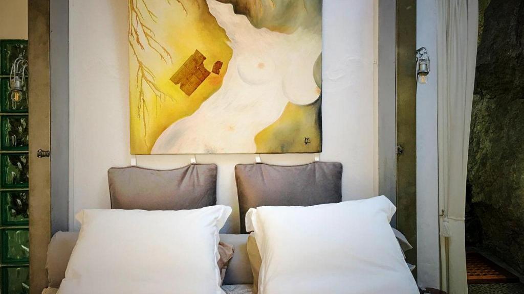 La particularité de cette chambre est indubitablement sa salle de bains avec sa baignoire construite autour de la roche et sa douche en cascade où l'eau ruisselle sur un rocher.